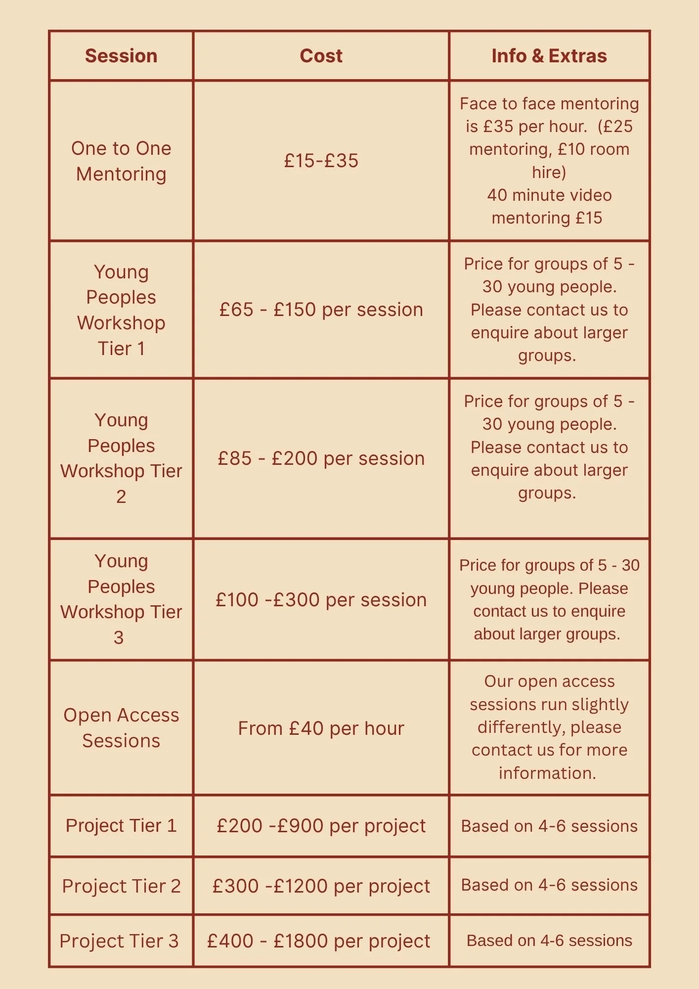 HB Youth is a community interest company, our fees go towards the cost of delivery, which includes, but is not limited to: fair staff wages, resources, planning time, travel, and insurance. We are a not for profit organisation, any money made above and beyond our costs is reinvested back to our work with young people and the community